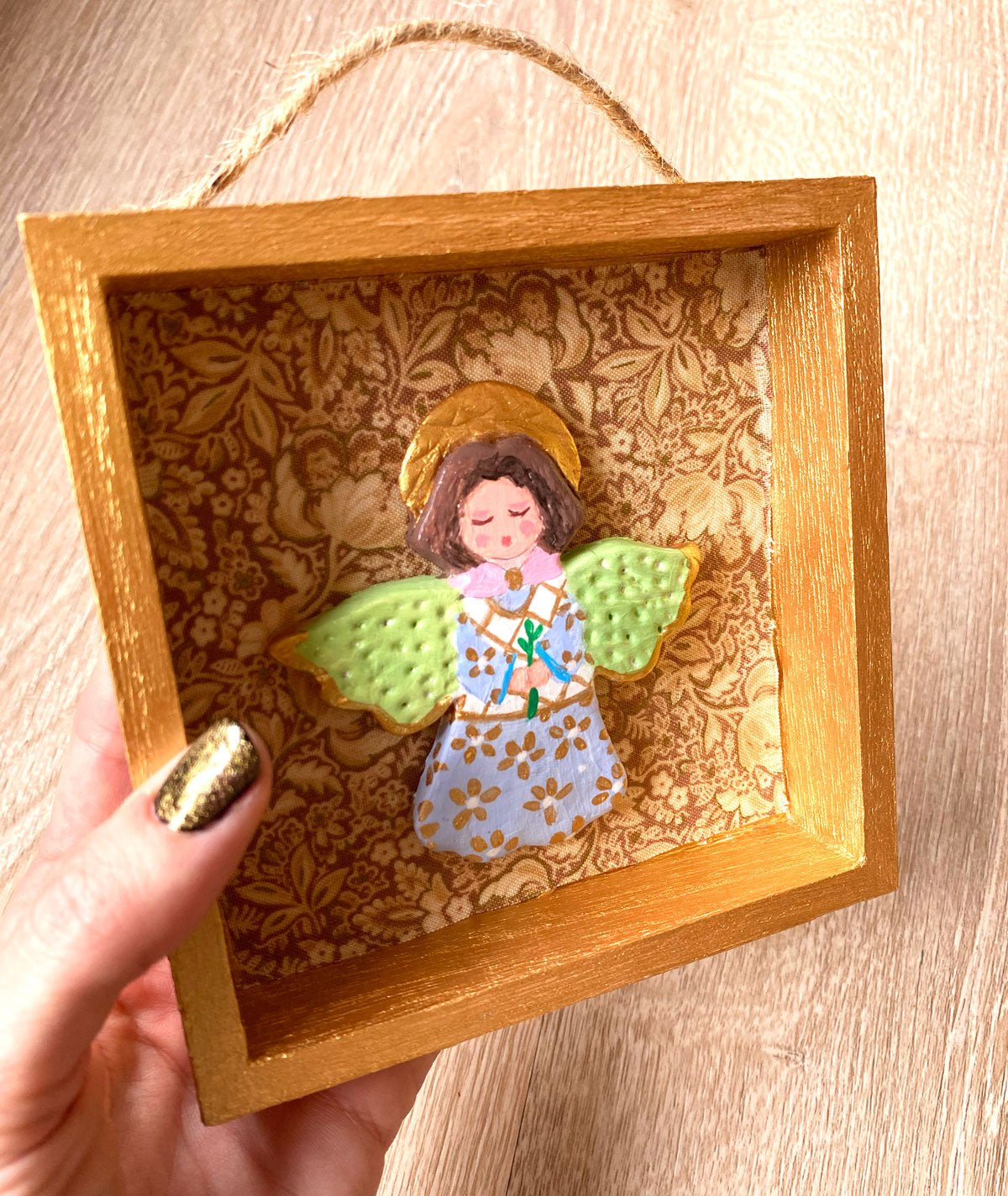 Bring a touch of handmade magic into your home with this 5x5” Angel Keepsake — lovingly sculpted, hand-painted, and framed inside a golden shadow box.
